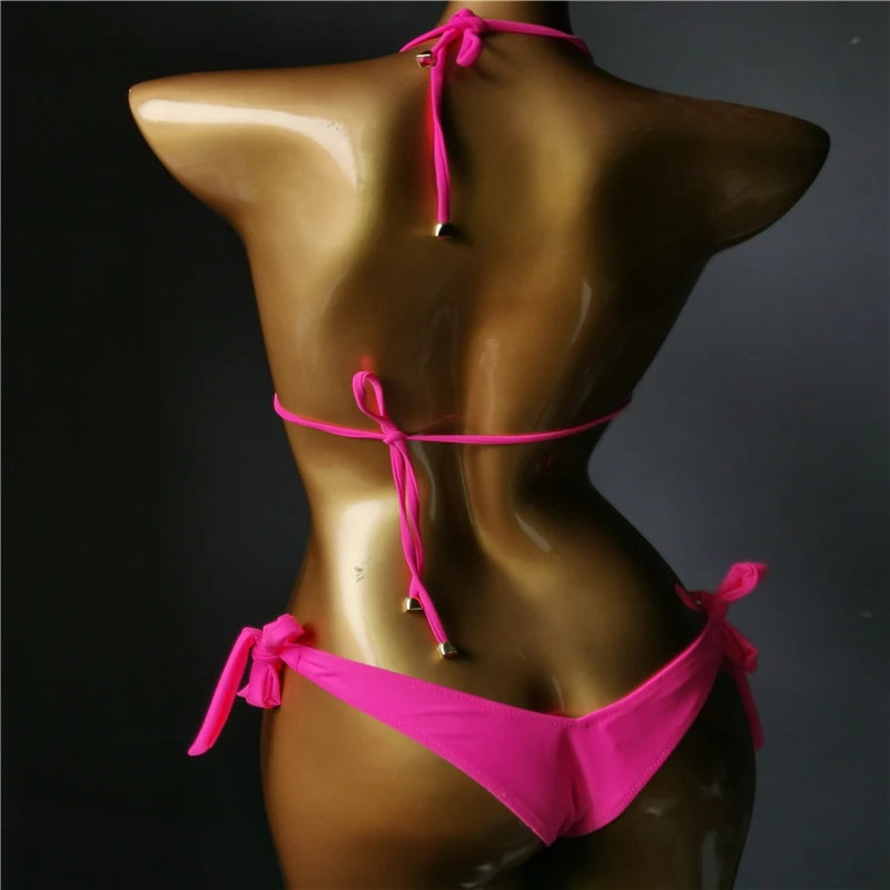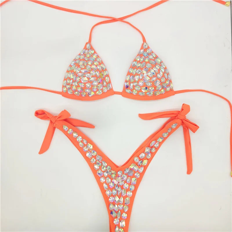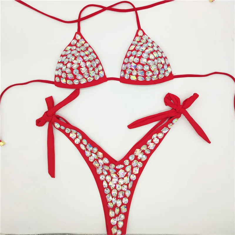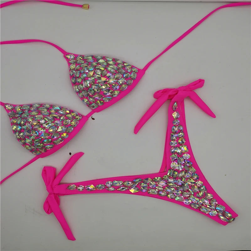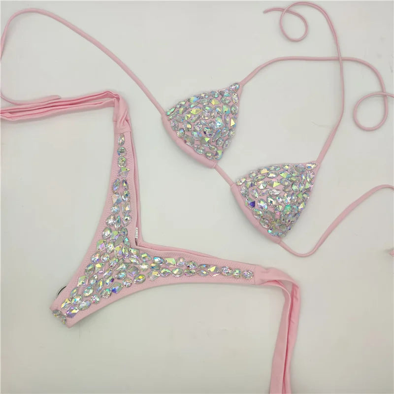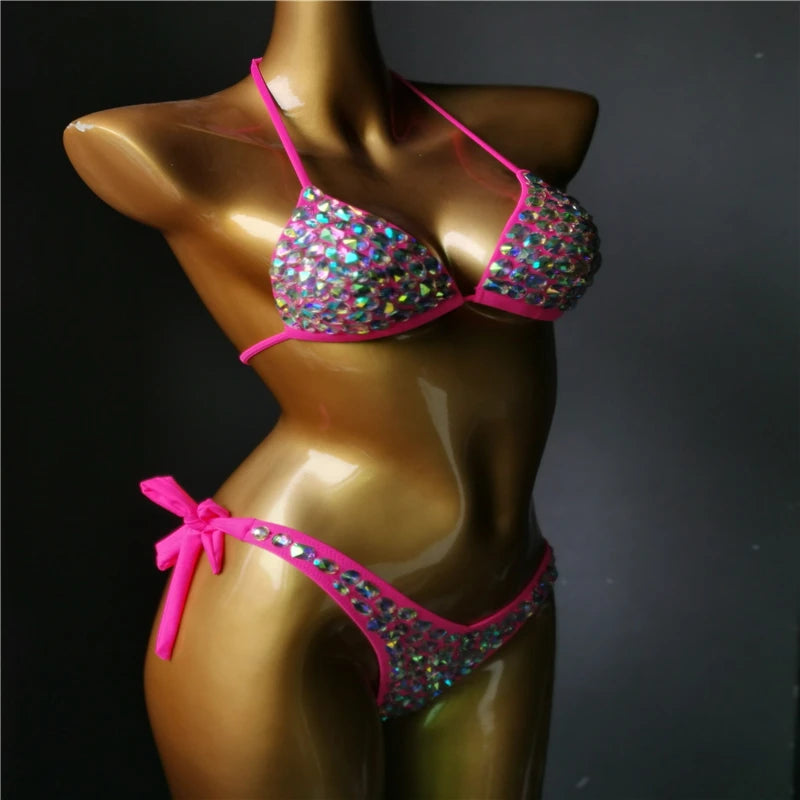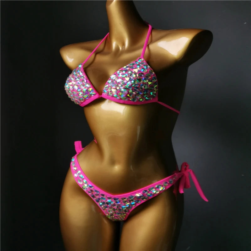 Dazzle in every direction with Pink Prism Luxe a show-stopping bikini made for the spotlight. This two-piece is drenched in shimmering, multi-faceted crystals that catch the light (and every gaze) with every move. The classic triangle top and high-cut tie-side bottoms are reimagined with a luxe, rhinestone-studded twist, blending bold color with unapologetic sparkle. Whether you're owning the beach or lighting up the dance floor, Prism Luxe is your invitation to shine unapologetically.